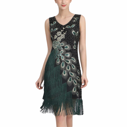 Green Tassel Peacock Flapper Dress with Accessories Set