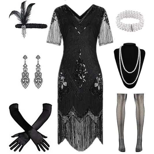V-Neck Art Deco Flapper Dress with Accessories Set