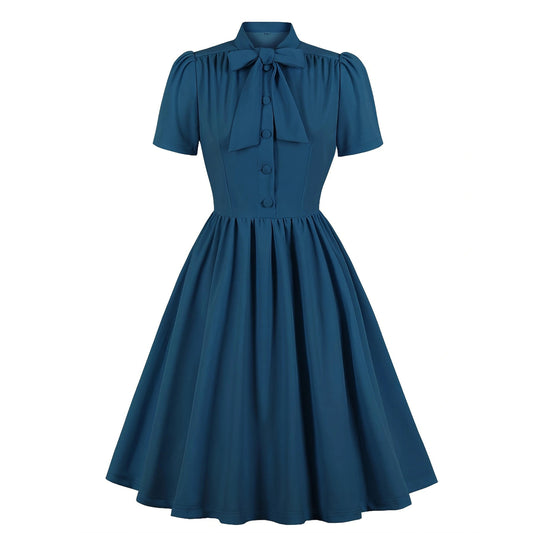 Women's 1950s Solid Teal Bow Tie Neck Button Down A-Line Tea Dress