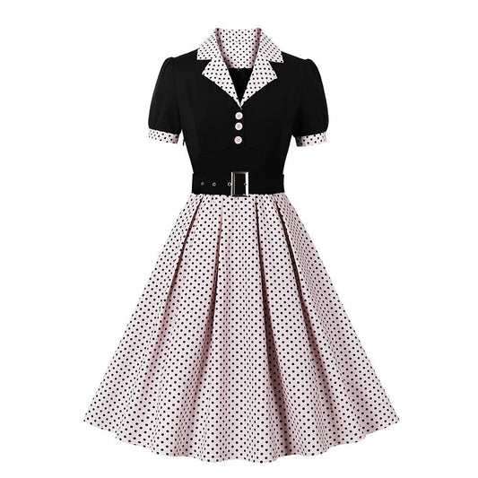 Women's 1950s Polka Dot Patchwork Lapel Collar Belted A-Line Rockabilly Dress