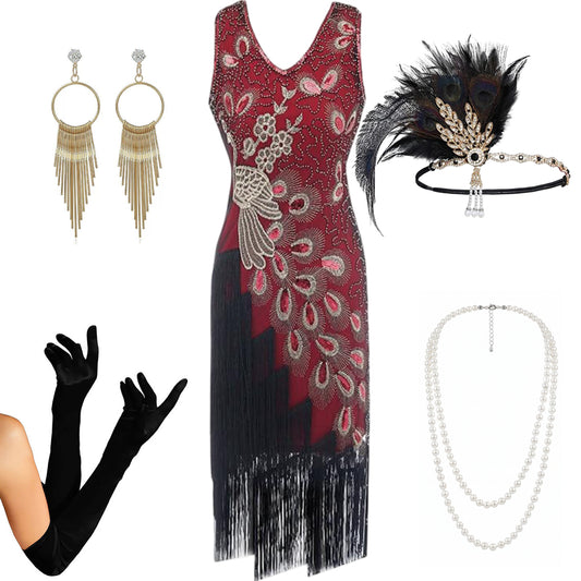 Irregular Tassel Peacock Flapper Dress with Accessories Set