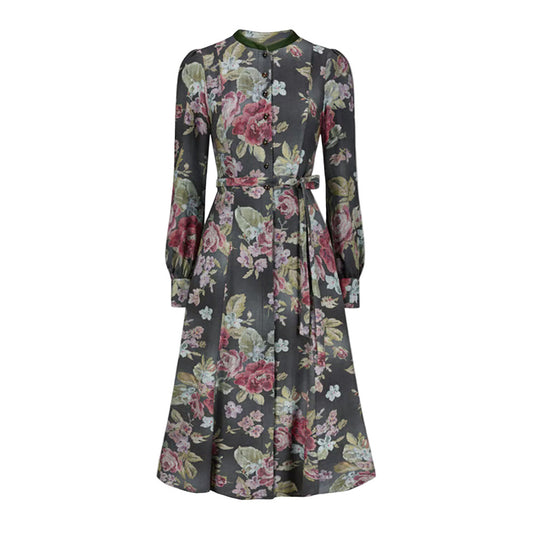 Women's Floral Long Sleeve Dirndl Dress Stand Collar Button Down with Apron