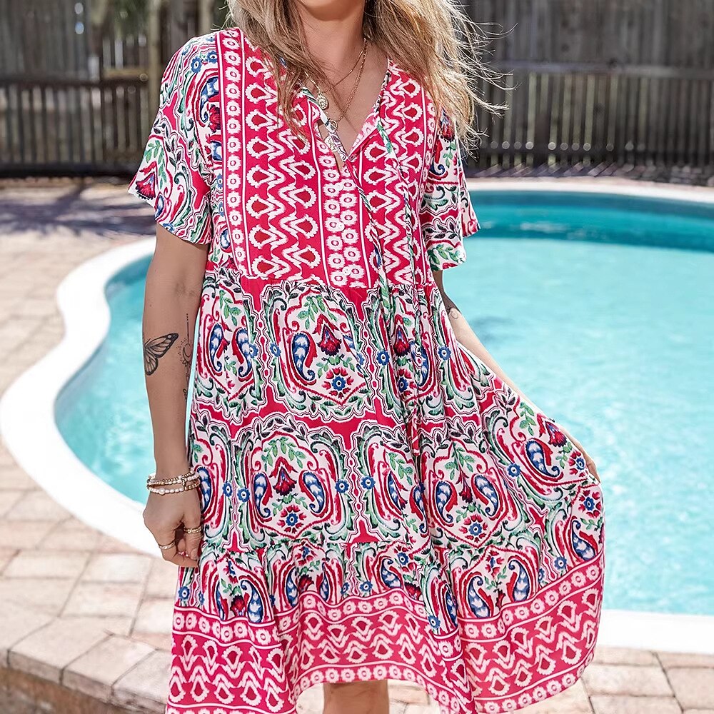 This women’s boho mini dress features a bold patterned print inspired by 1970s retro style. Designed with short sleeves and a relaxed, flowy fit, it offers a comfortable and stylish look. Perfect for music festivals, retro parties, and summer wear.