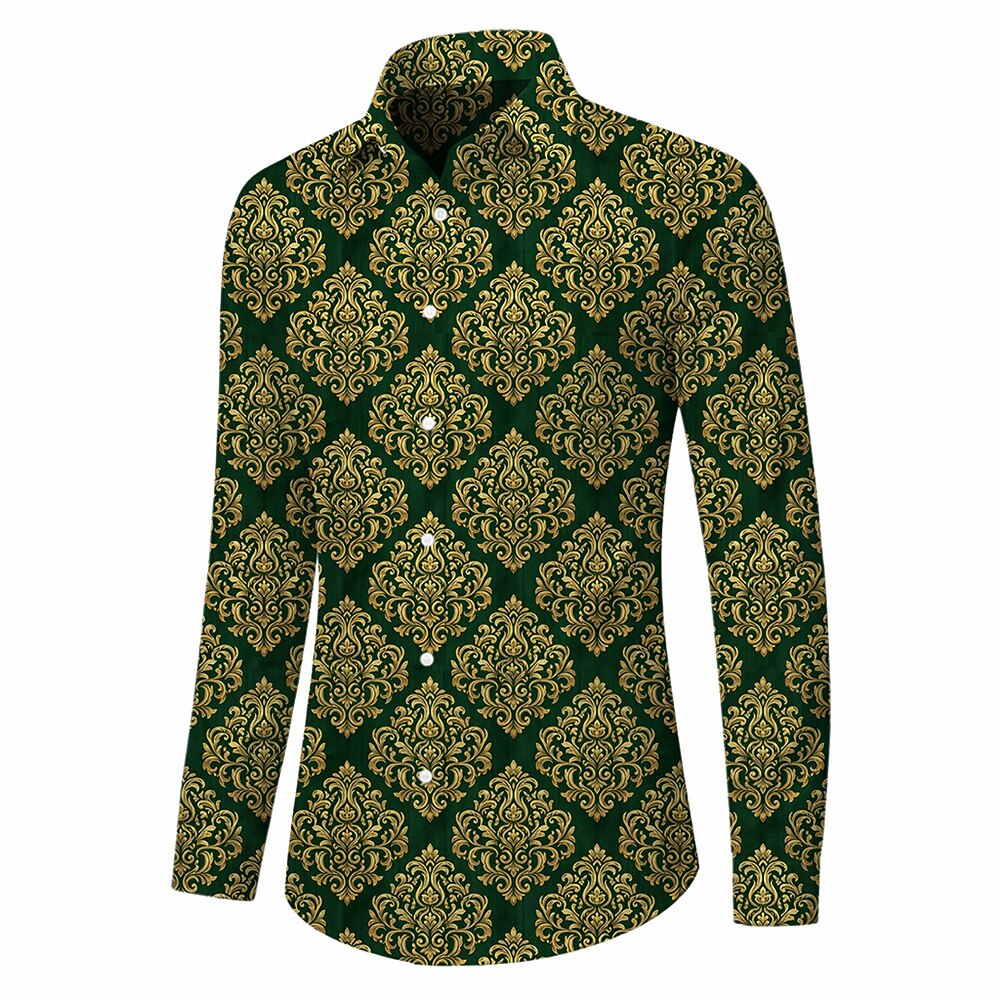 This men’s retro aloha shirt features a bold 1970s hippie-inspired design with intricate ornate damask motifs in a refined green and gold color palette. Made from lightweight polyester with micro-elasticity, it offers comfort and ease of movement. The long-sleeve style makes it suitable for daily wear as well as parties, evening events, and themed retro occasions. Easy to care for, it is washable and suitable for both wet and dry cleaning. Perfect for adults who appreciate classic vintage elegance and statement retro fashion.
