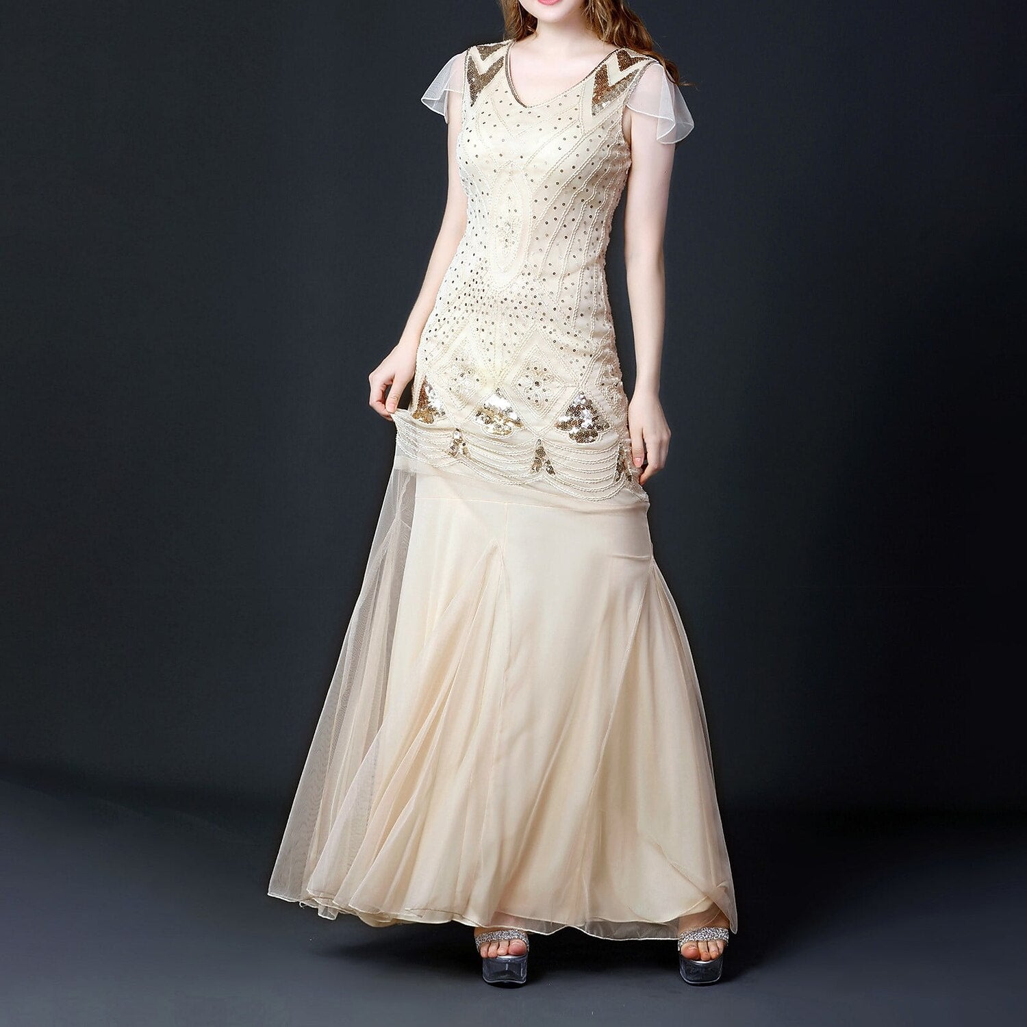 This women’s flapper dress features shimmering sequins and a flattering V-neck, inspired by 1920s Great Gatsby style. Designed with short sleeves and an ankle-length silhouette, it offers an elegant retro vintage look. Perfect for evening parties, weddings, and masquerade events.