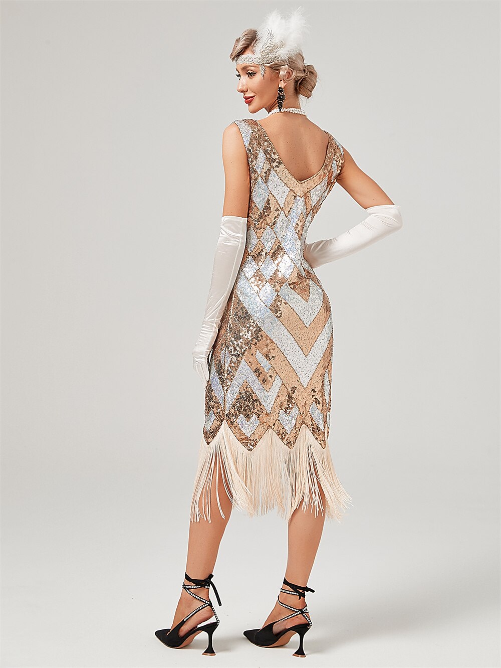 This women’s flapper dress features a classic 1920s design with shimmering sequins and tassel fringe for graceful movement. Designed with a sleeveless cut, V-neck, and midi-length silhouette, it offers a flattering vintage look. Perfect for parties, proms, and Gatsby-themed events.