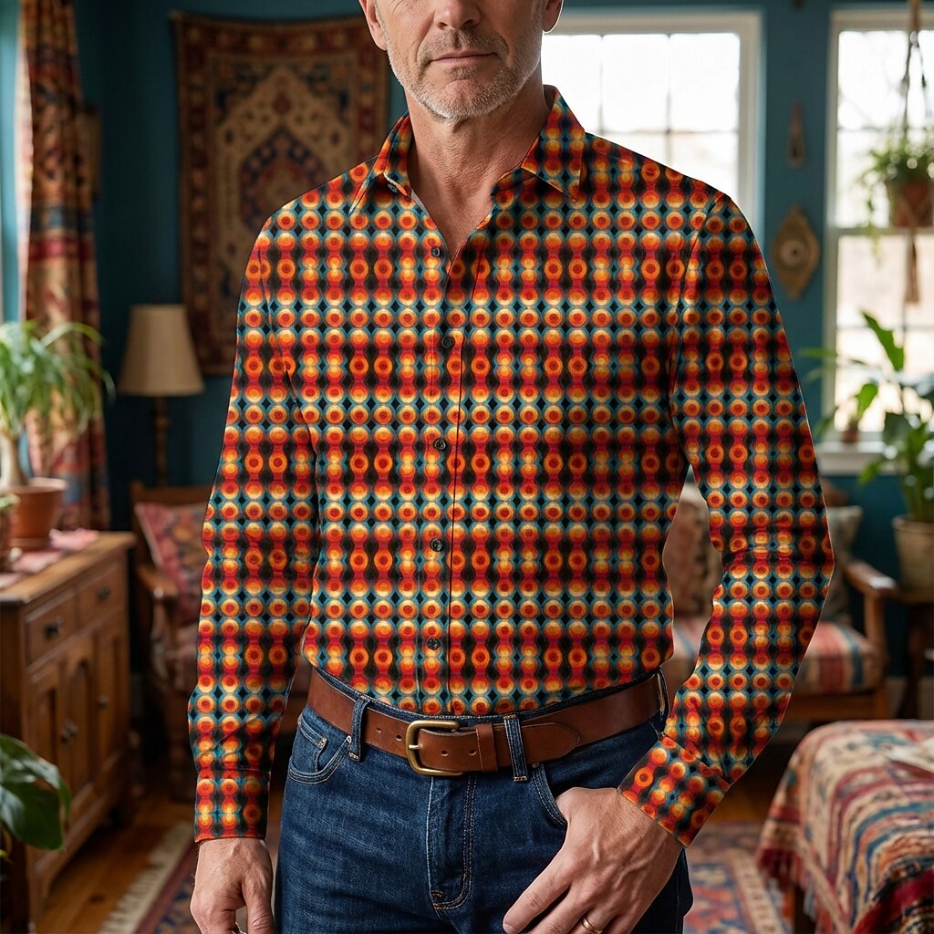 This men’s retro aloha shirt features a bold 1970s hippie-inspired design with repeating vintage geometric circle motifs in warm, earthy tones. Made from lightweight polyester with micro-elasticity, it offers comfort and ease of movement. The long-sleeve style makes it suitable for daily wear as well as parties, music festivals, and themed events. Easy to care for, it is washable and suitable for both wet and dry cleaning. Perfect for adults who appreciate classic retro and vintage fashion.