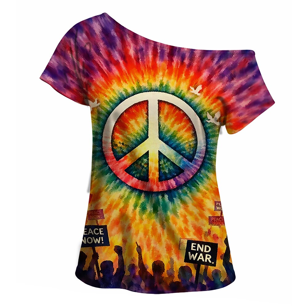 This women’s one-shoulder T-shirt showcases a colorful tie-dye design with a central peace symbol and bold messages, "PEACE NOW!" and "END WAR." The design also includes silhouettes of people holding protest signs. Perfect for promoting peace at music festivals, retro parties, and carnival events. Made from polyester with micro-elasticity, it offers both comfort and style with its trendy off-the-shoulder design.
