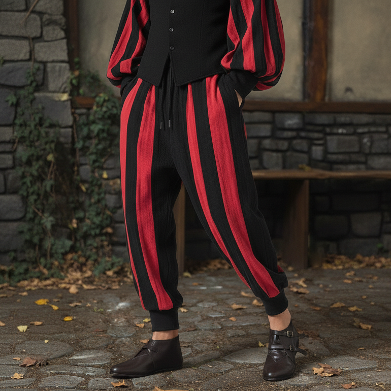 Add bold historical flair to your wardrobe with these Men's Lace-Up Landsknecht Pants. Inspired by the flamboyant style of 16th-century mercenaries, these Renaissance trousers feature striking red and black vertical stripes, roomy pleats, and a comfortable lace-up waistband for an adjustable fit. Crafted from lightweight, breathable cotton, they're perfect for Renaissance fairs, cosplay, theatrical performances, or unique everyday wear. The elastic cuffs provide a snug, tapered look, while deep side pockets add modern functionality. Stand out in timeless fashion with these statement pants.