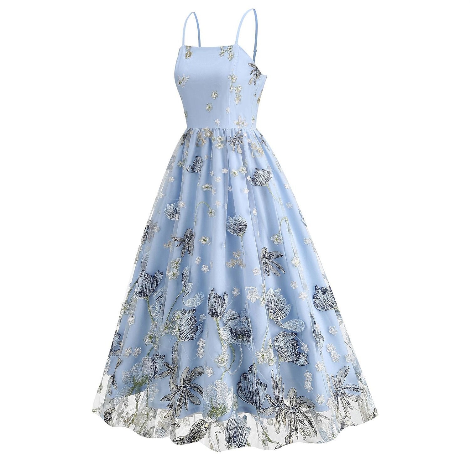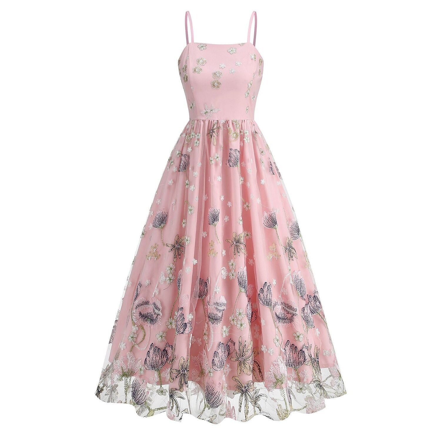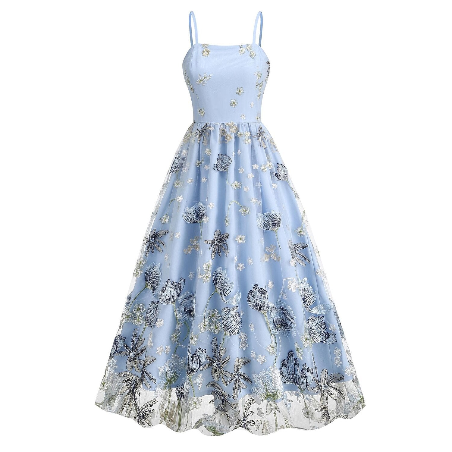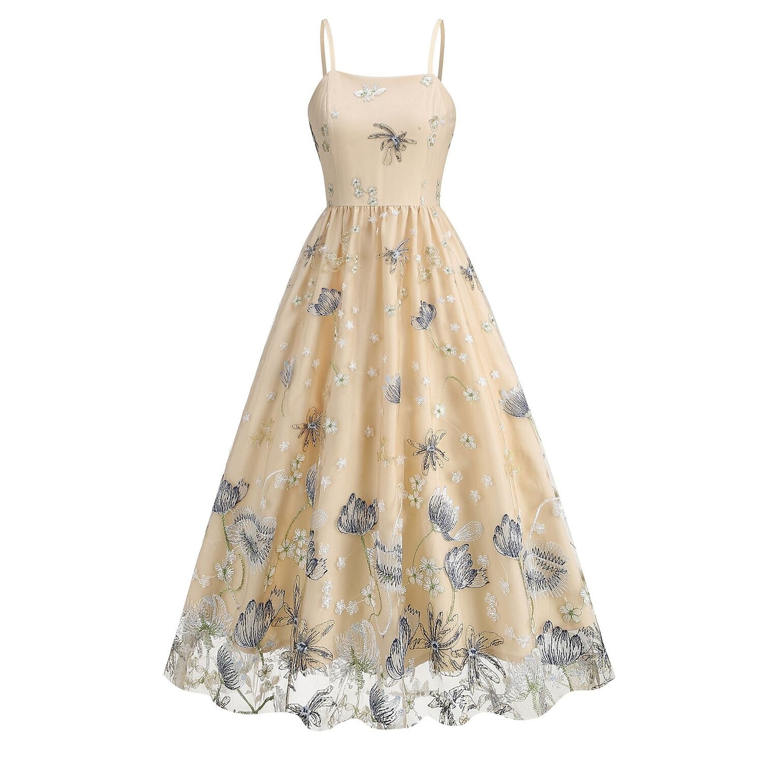 This women’s midi dress features an elegant 1950s-inspired A-line silhouette with a soft mesh overlay and delicate floral embroidery. Designed with spaghetti straps and a square neckline, it creates a light and graceful look. Perfect for casual outings, tea parties, daily wear, and summer occasions.