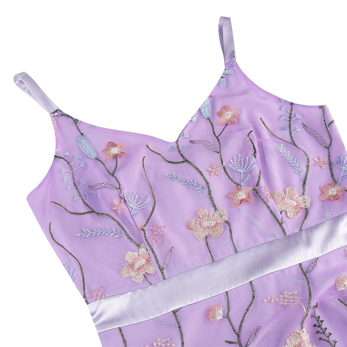 This women’s midi dress features an elegant 1950s-inspired silhouette with delicate floral embroidery and a soft, feminine look. Designed with spaghetti straps, a flattering V-neck, and a fit-and-flare A-line shape, it creates a graceful vintage style. Perfect for casual outings, tea parties, and spring or summer occasions.