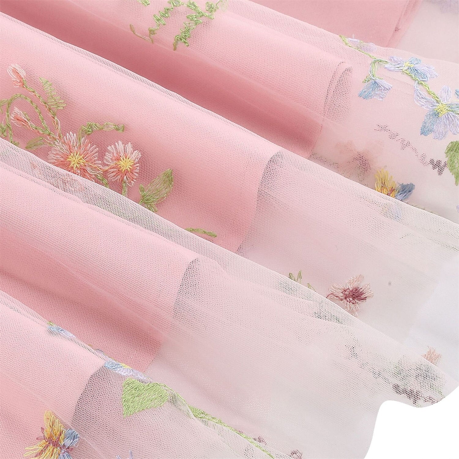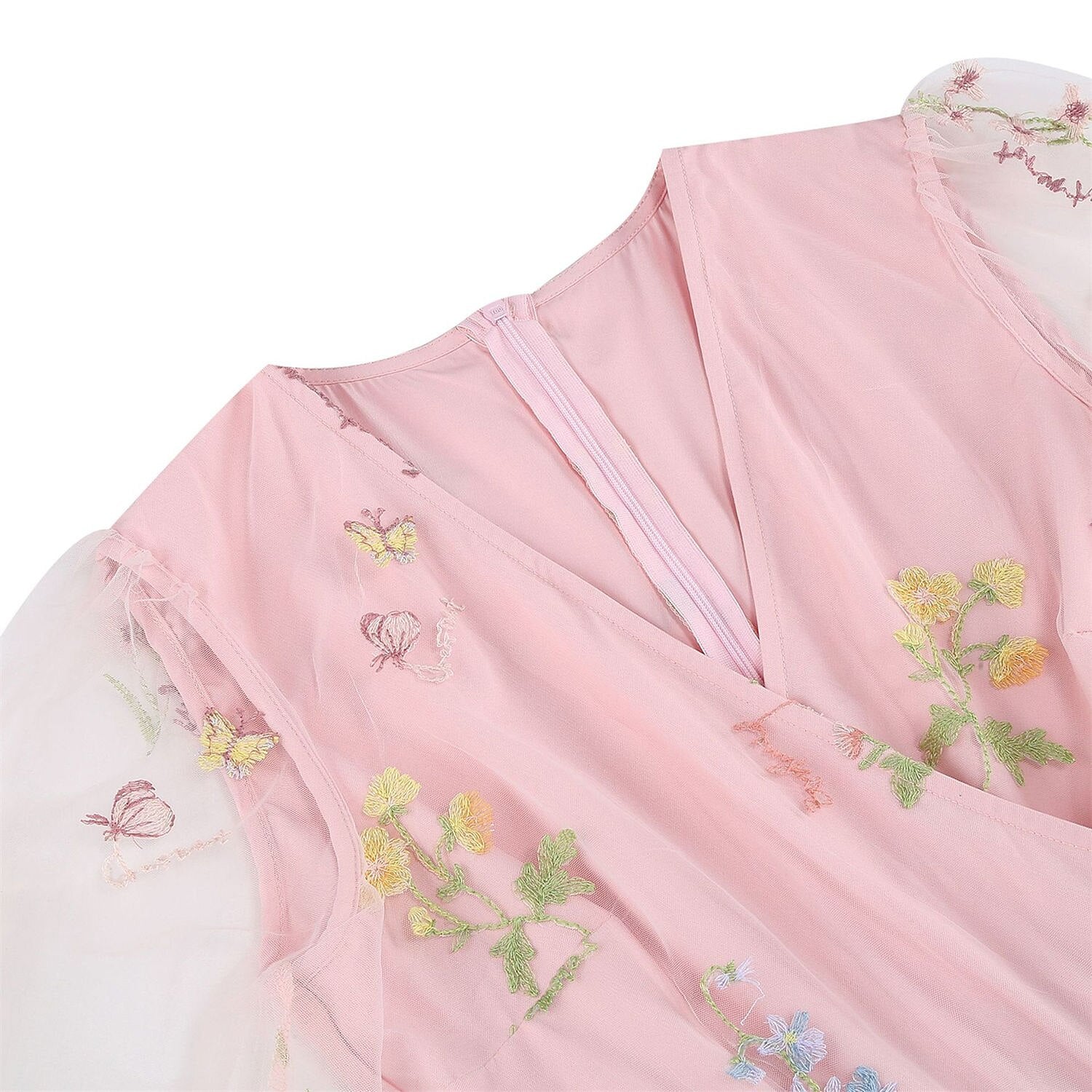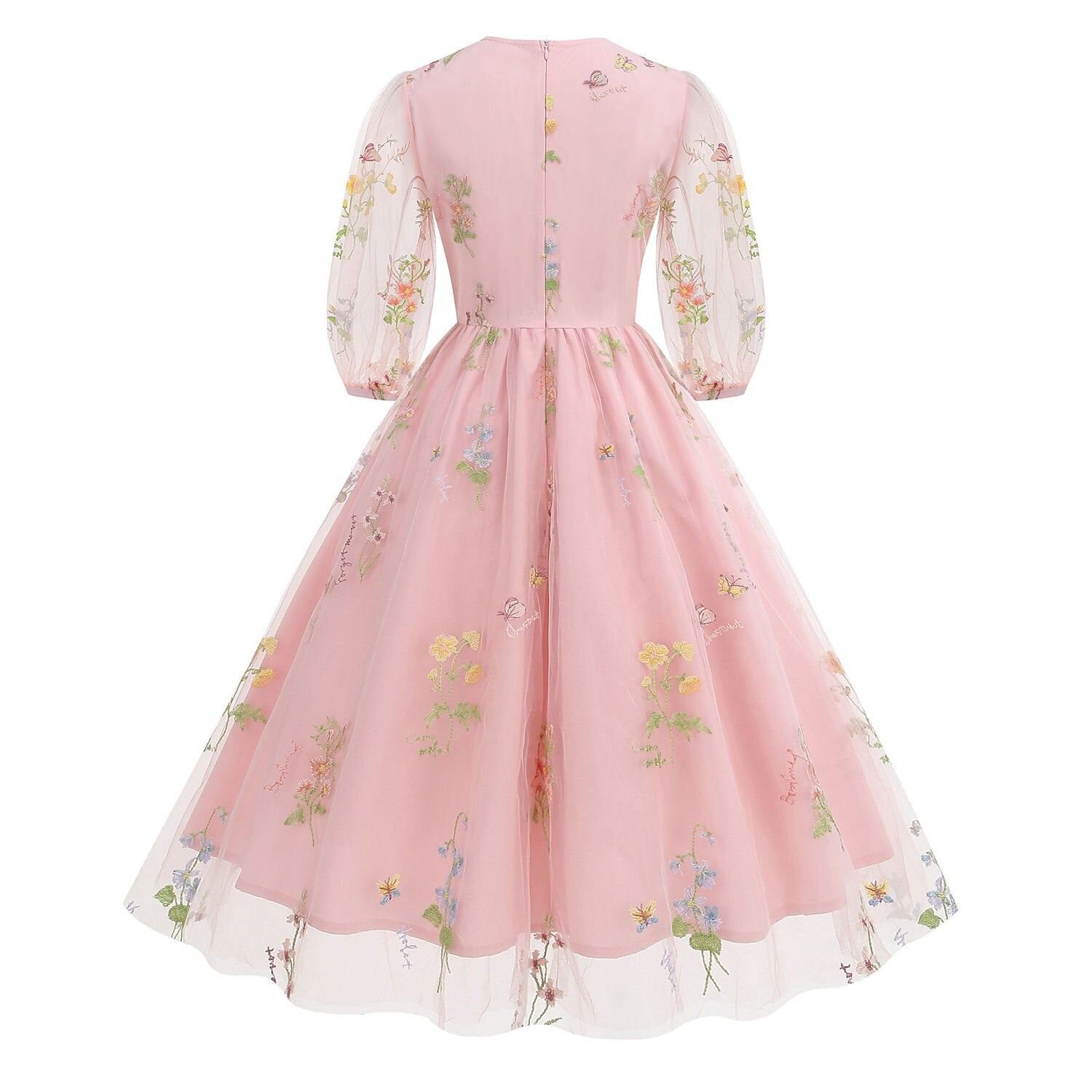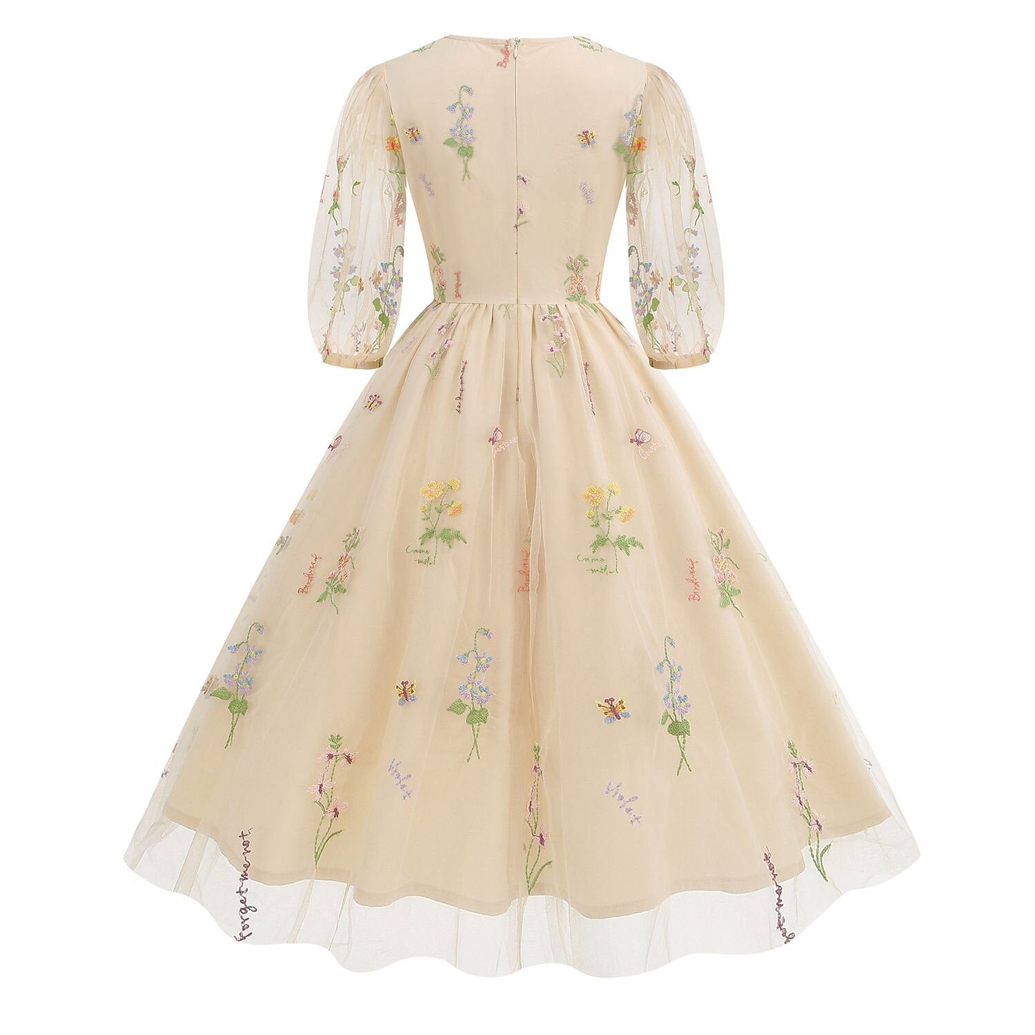 This women’s midi dress features an elegant 1950s-inspired style with a soft mesh overlay and delicate floral embroidery. Designed with a flattering V-neck, airy sleeves, and an A-line silhouette, it creates a graceful and feminine look. Perfect for tea parties, evening occasions, and spring or summer wear.
