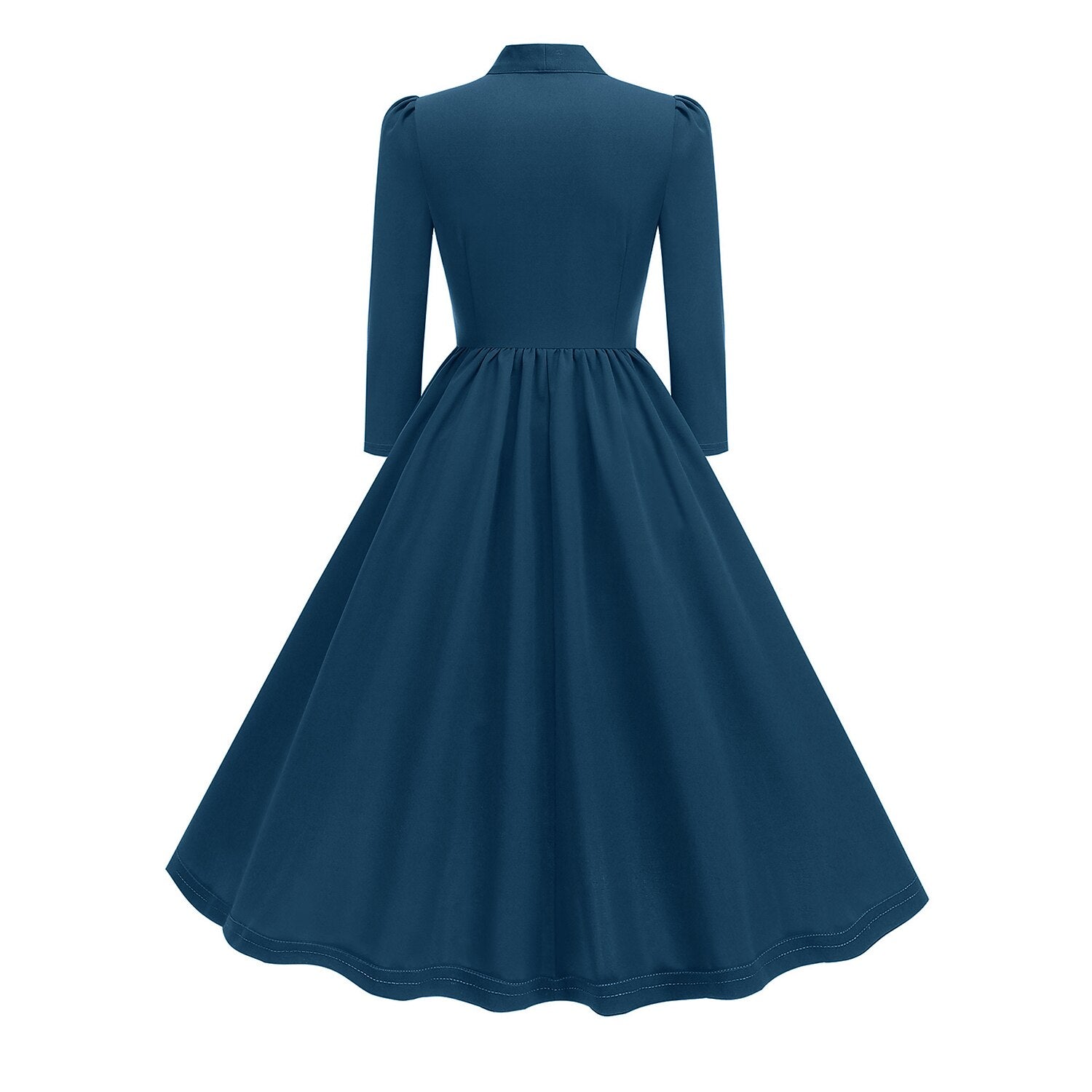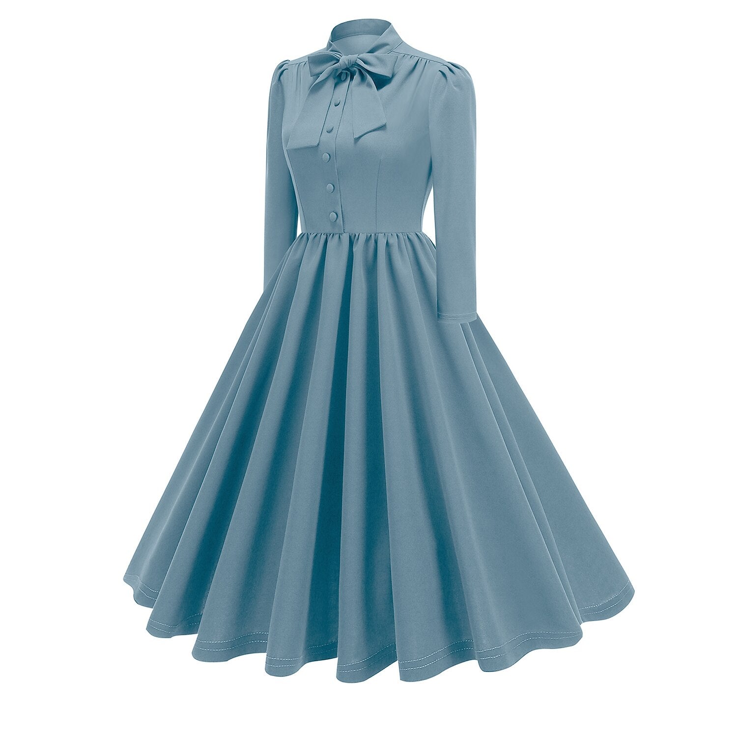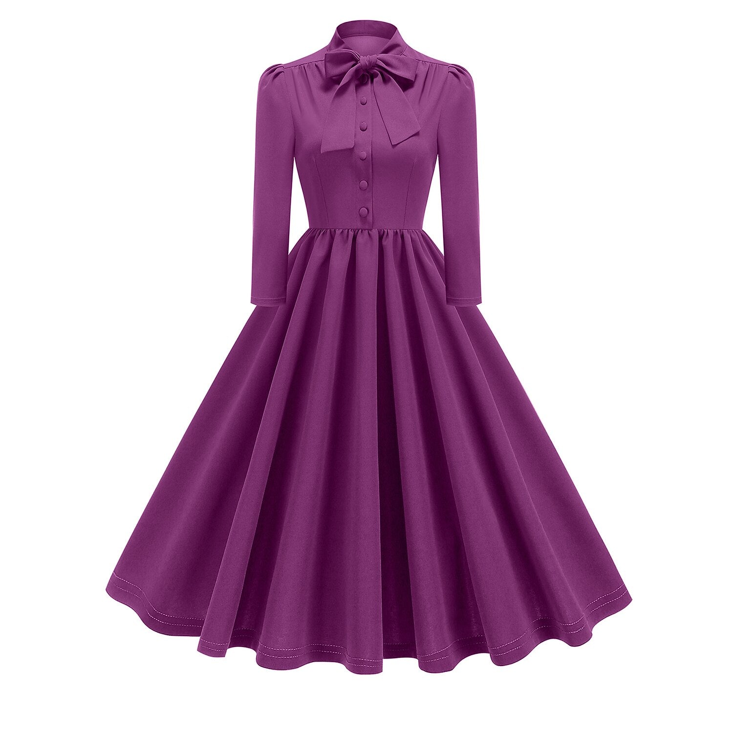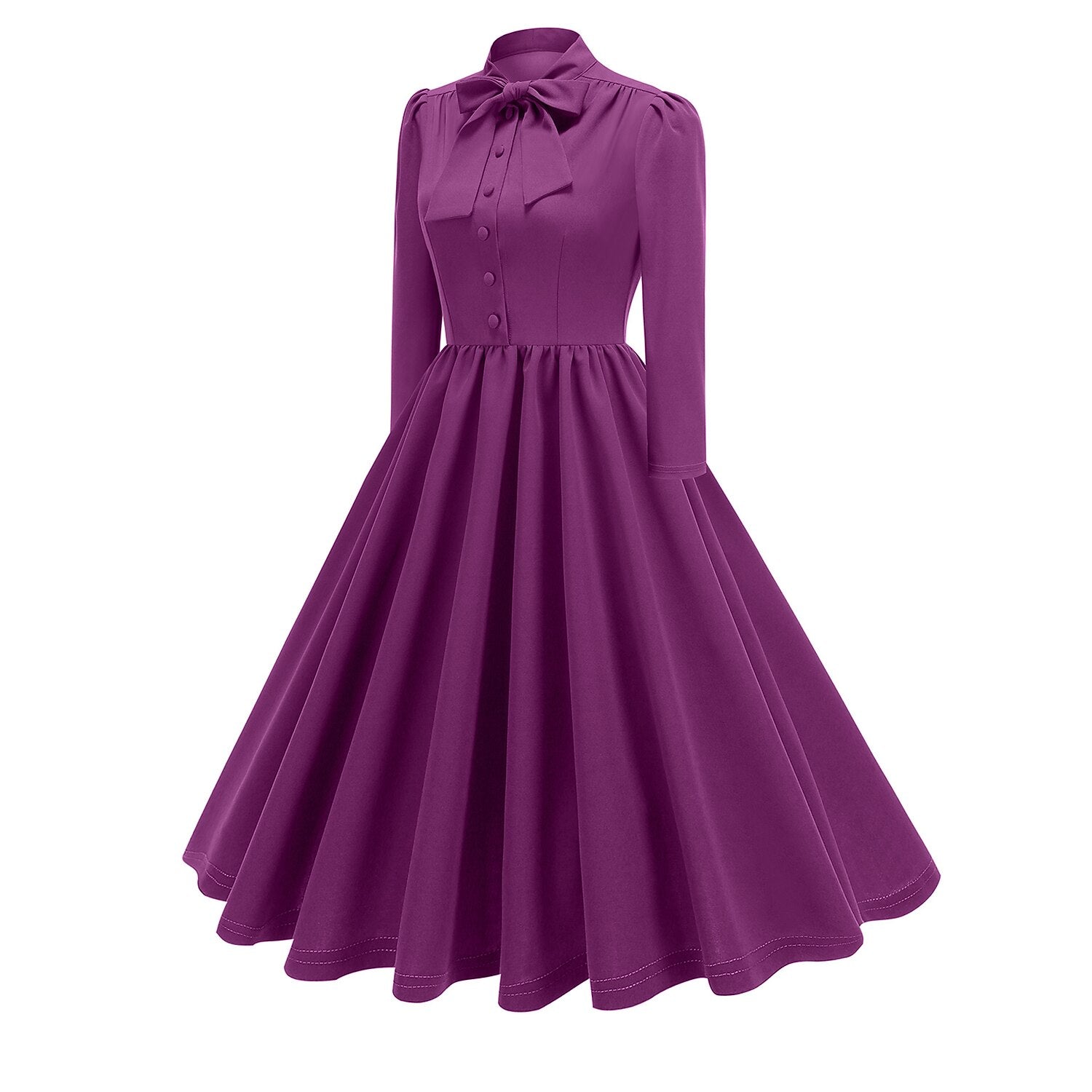 Channel the timeless grace of Audrey Hepburn with this exquisite 1950s Retro Vintage A-Line Dress. Designed in a striking Solid hue, this gown exudes classic elegance perfect for the holiday season. It features a sophisticated high neckline with a charming Bow Tie, a button-down bodice, and elegant Long Sleeves with subtle puff shoulders. The waist is cinched before flowing into a gorgeously pleated A-line skirt that offers a flattering silhouette for all body types. Crafted from durable Polyester, this dress is comfortable and machine washable, making it an ideal choice for New Year celebrations, Carnivals, or adding a touch of vintage flair to your Casual Daily wardrobe.