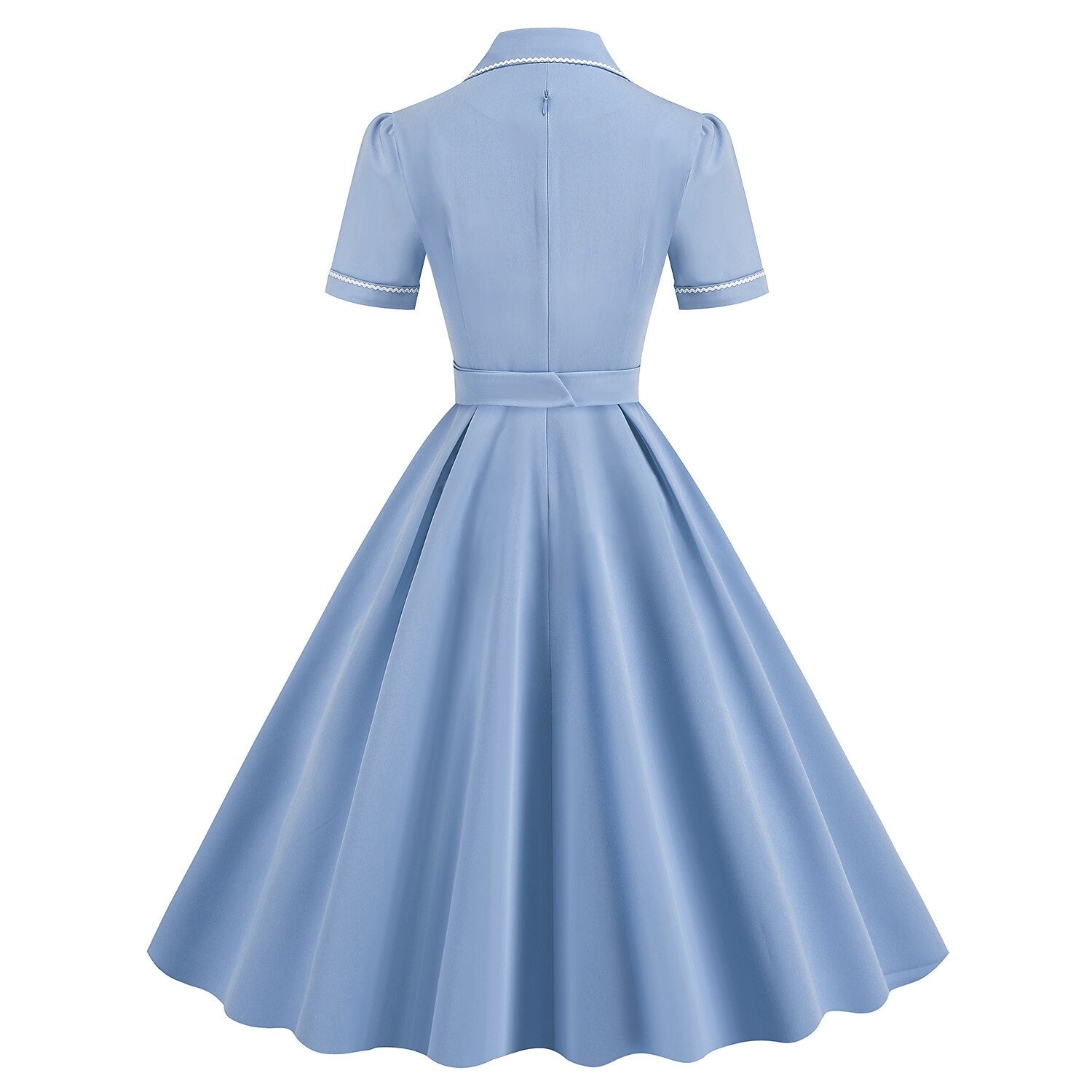 Embrace the classic diner chic of the rockabilly era with this charming 1950s Retro Vintage Swing Dress. Designed in a soft Solid hue, this dress features distinctive white piping details on the Lapel Collar, sleeve cuffs, and decorative chest pockets, giving it a polished and playful look. The button-down bodice and matching belt with a round buckle cinch the waist to create a flattering A-line silhouette that flows into a full swing skirt. Crafted from durable Polyester, this dress is versatile enough for daily wear, retro-themed bachelorette parties, or even as a stylish costume for Halloween or Masquerades. Machine washable and effortless to style, it brings a touch of nostalgic elegance to any occasion.