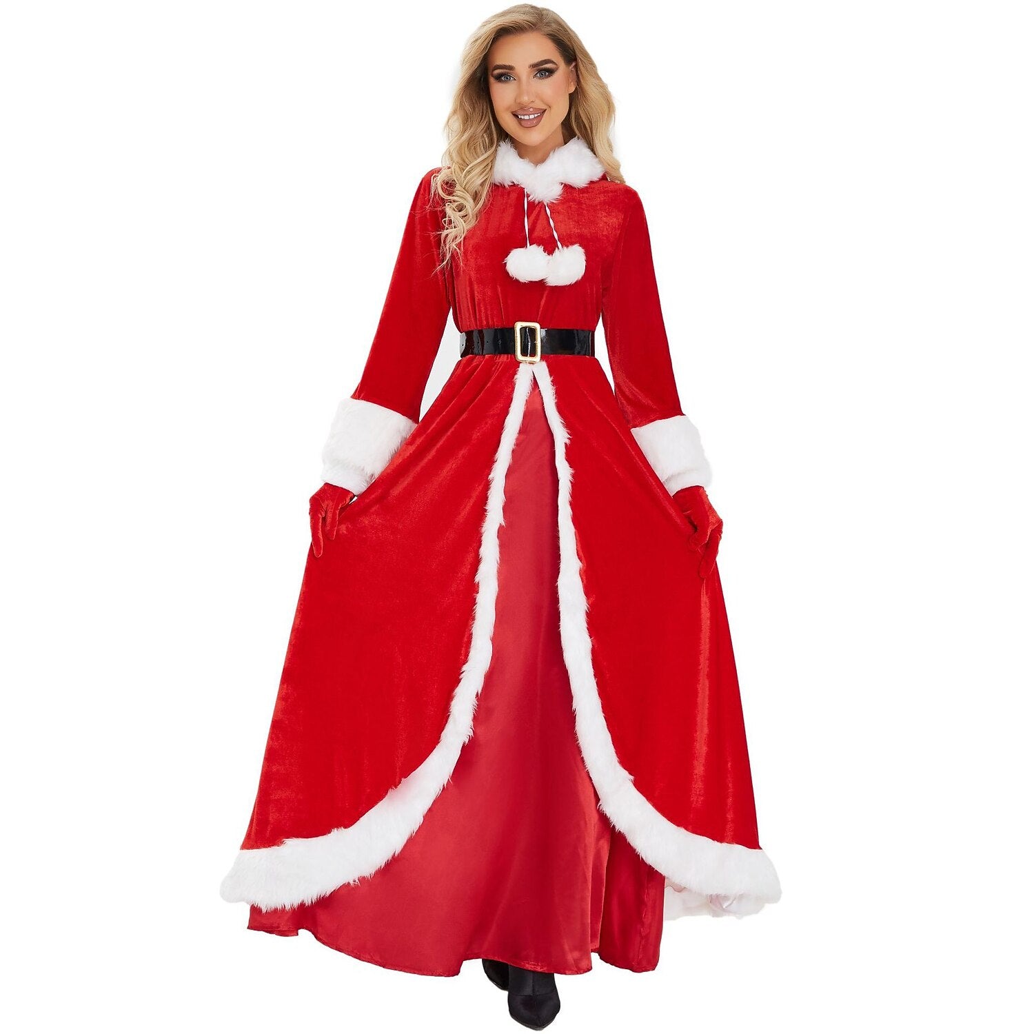 Celebrate the holidays in style with this charming hooded Mrs. Claus costume for women. Crafted from luxurious velvet, this festive Santa-style fancy dress is perfect for any Christmas or New Year's party. The complete outfit, including a dress and matching belt, ensures you'll be the star of any seasonal celebration. What's in the box: Belt, Dress