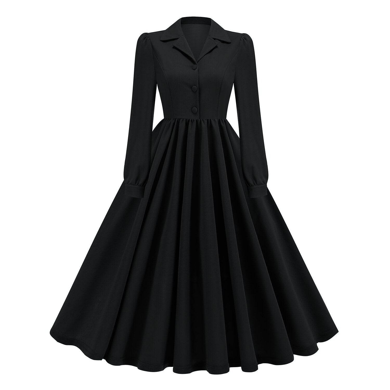 Women's 1950s Solid Color Lapel Collar Long Sleeve Flare Dress