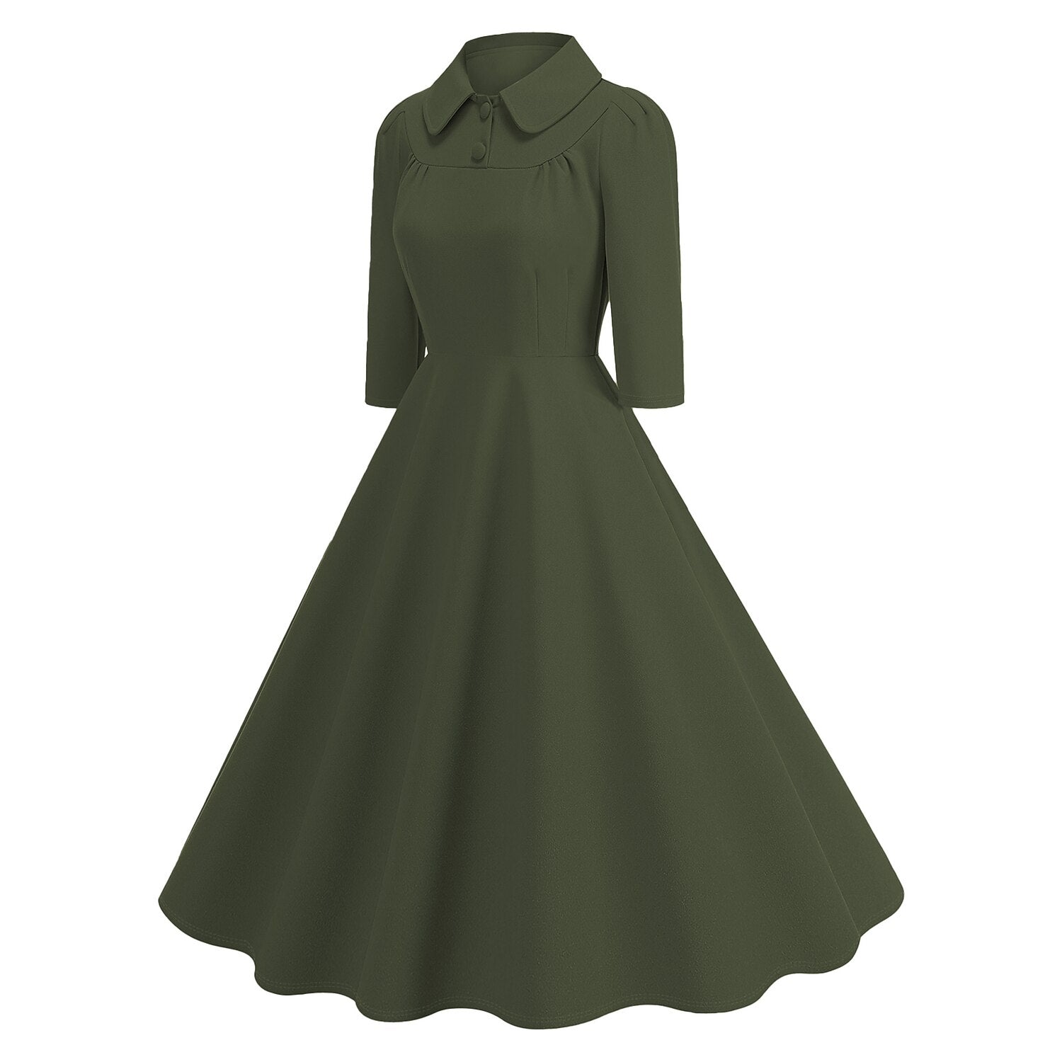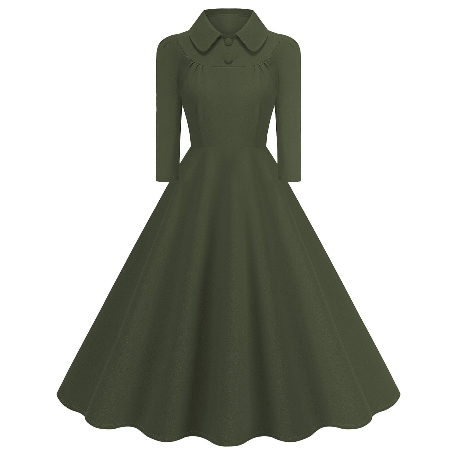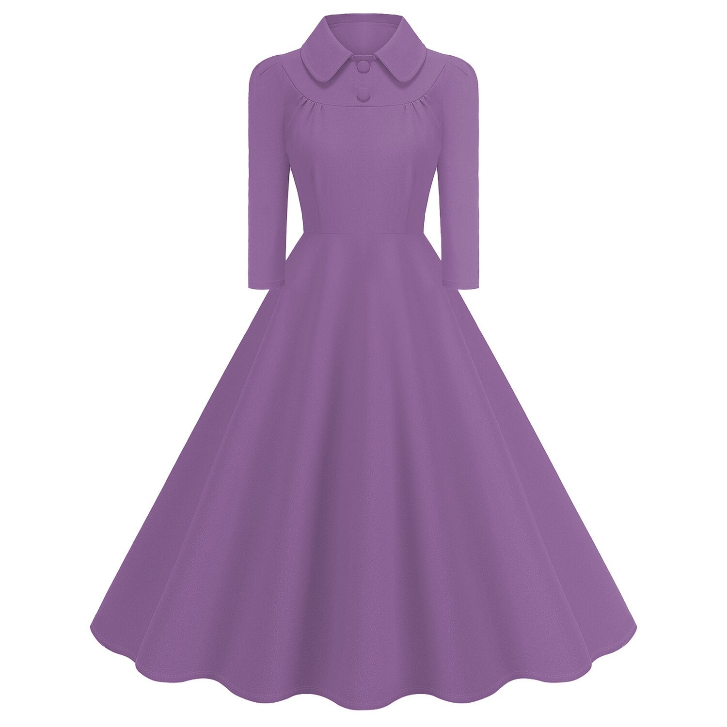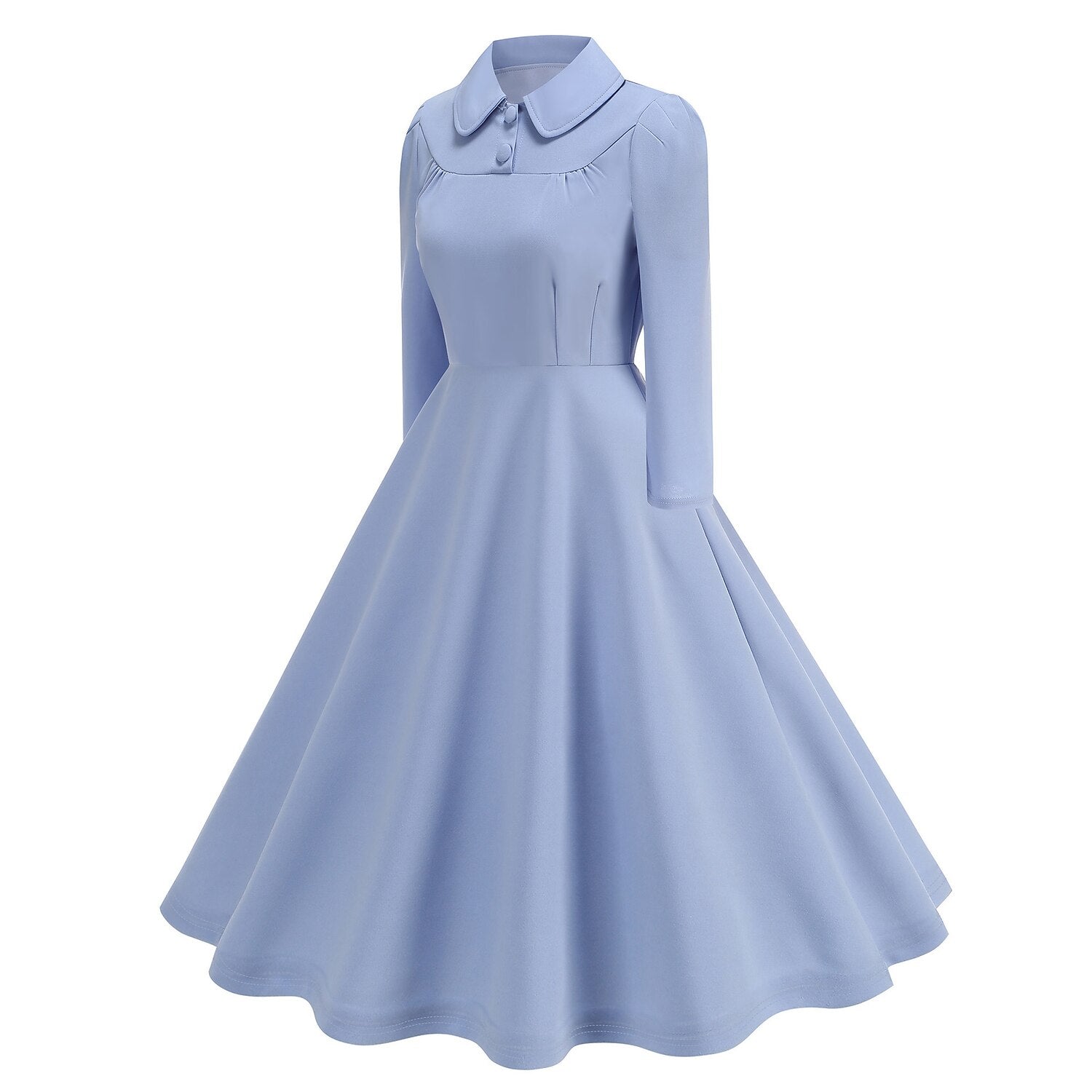 Exude timeless elegance with this sophisticated 1950s Retro Vintage Flare Dress. Designed in a rich Solid color hue, this gown captures the modest charm of the mid-century era. It features a classic rounded Peter Pan Collar adorned with decorative buttons and subtle gathering at the bust, adding a touch of refined detail. The Long Sleeves provide elegant coverage, making it suitable for cooler weather or evening events. The fitted waist flows gracefully into a voluminous swing skirt, creating a universally flattering silhouette. Crafted from durable Polyester, this machine-washable dress is an impeccable choice for Cocktail Parties, holiday festivals, or a vintage-themed masquerade.