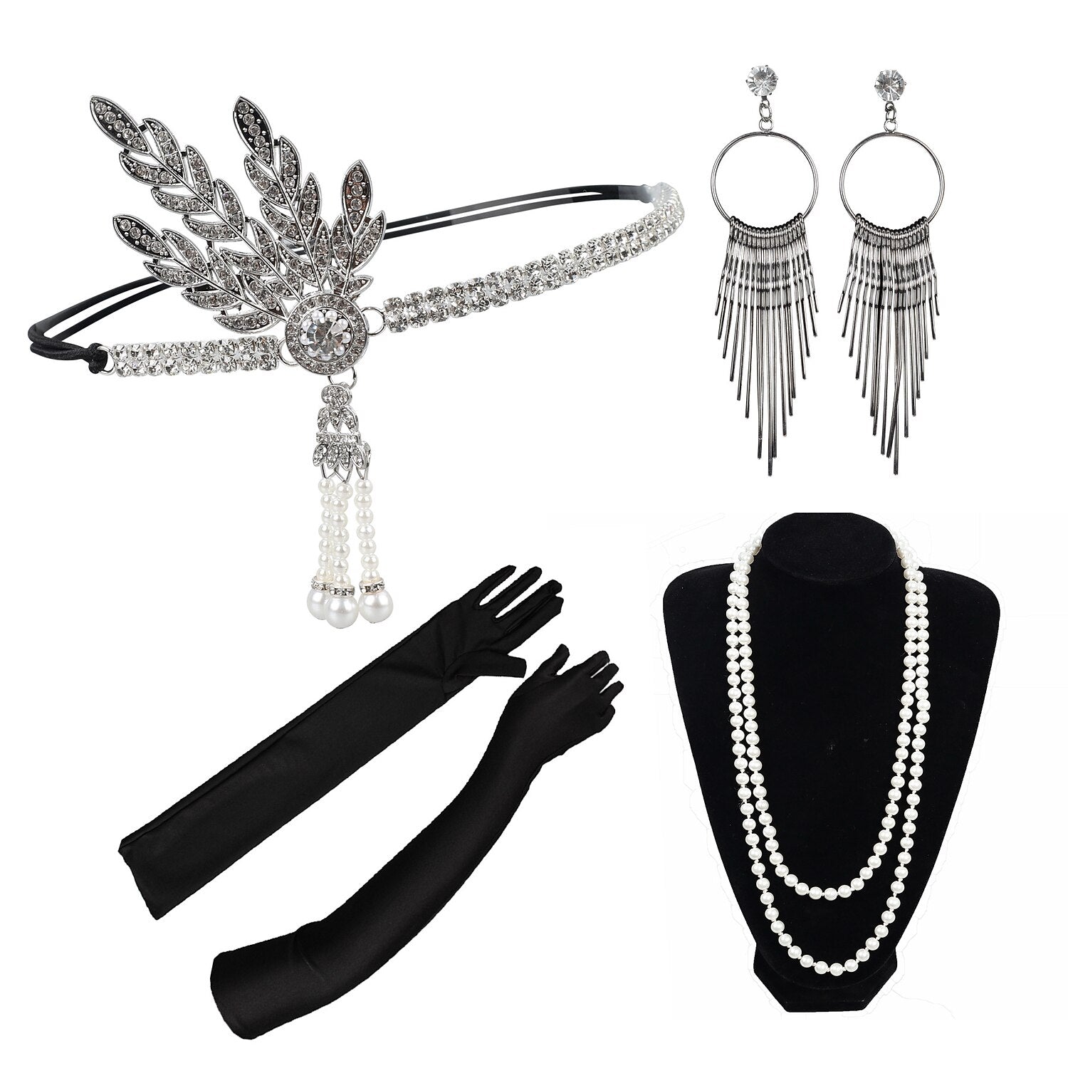 Channel your inner Flapper Girl with this Women's Retro Vintage Roaring 20s Accessories Set, perfect for a Great Gatsby themed event, Charleston Dance, Retro Theme Party, Carnival, or Christmas. This washable adult alloy set includes a stylish feather headband, gloves, necklace, earrings, and bracelet, suitable for all seasons. What's in the box: Headband, Gloves, Bracelet, Necklace, Earrings.