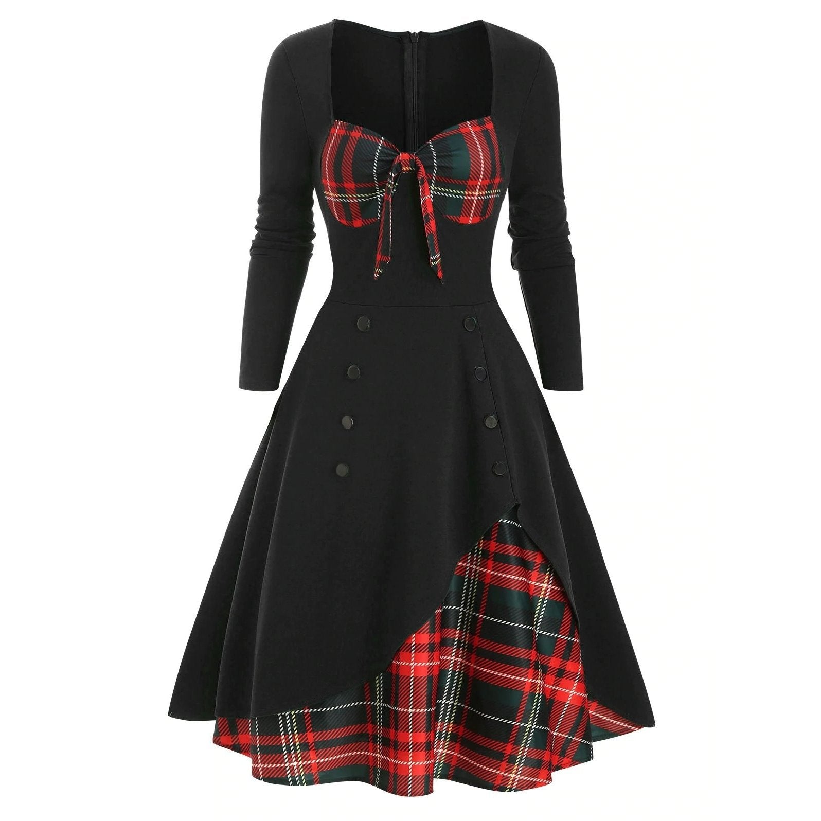 Embrace timeless elegance with this women's 1950s retro vintage swing dress. Perfect for Christmas parties, retro theme events, or a festive festival, this long-sleeve midi dress features a classic tartan check design. Made from washable polyester, this elegant flare dress combines vintage style with easy care for a stunning look this fall and winter. What's in the box: Dress