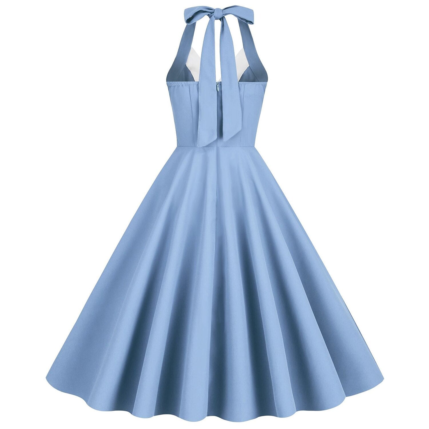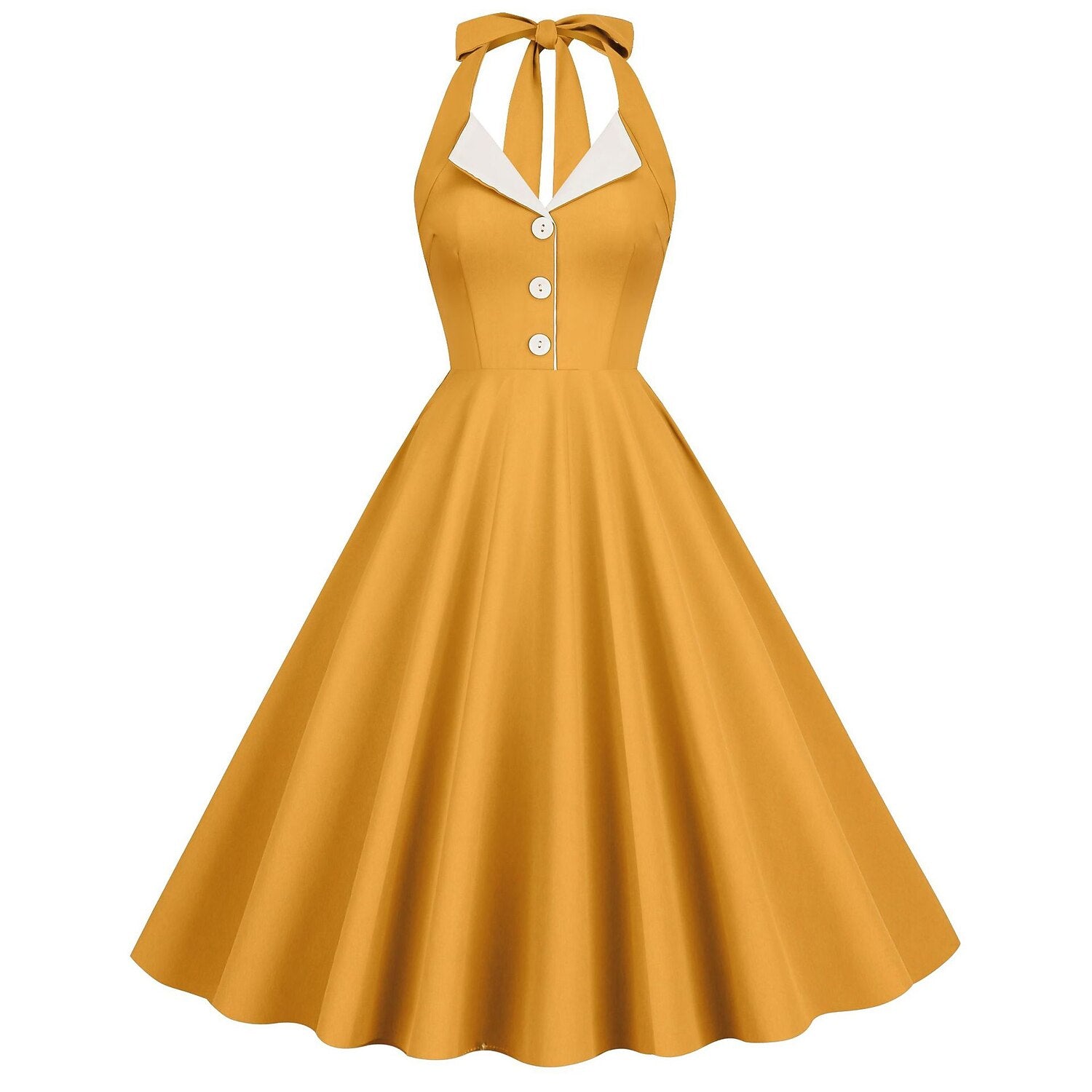 Add a splash of vibrant color and retro elegance to your wardrobe with this stunning 1950s Vintage Flare Dress. This dress features a chic self-tie Halter Neck accented by a contrasting White Lapel Collar and decorative white buttons down the bodice, evoking a classic diner or rockabilly aesthetic. Crafted from a comfortable blend of Polyester and Spandex, the fabric offers a slight stretch for a perfect fit, hugging the bodice before flowing into a voluminous swing skirt. Whether you are attending a Masquerade, enjoying a romantic date, or celebrating at a bachelorette party, this machine-washable gown ensures you look timelessly stylish.