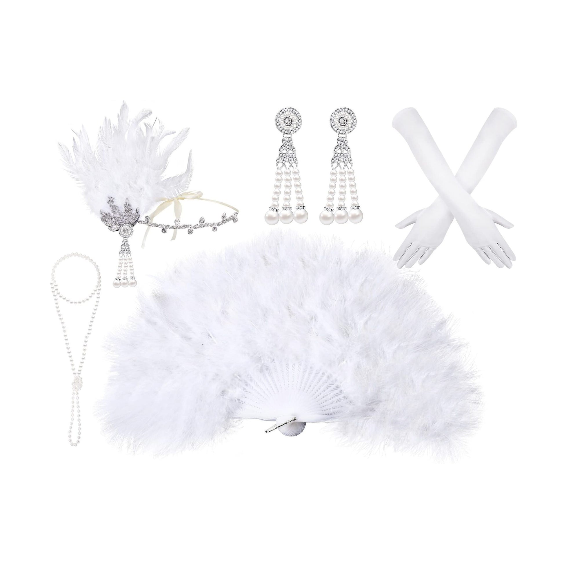 Channel the glamour of the 1920s with this Women's Vintage Great Gatsby Flapper Accessories Set, perfect for a Charleston-themed Bachelorette Party, Wedding Reception, Festival, or Masquerade. This adult feather and alloy set includes a stylish headband, earrings, and necklace, and is hand washable. What's in the box: Headband, Gloves, Fan, Necklace, Earrings.