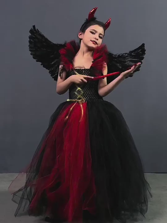 Let your child unleash her inner enchantress in this stunning Maleficent Devil Witch Costume. Designed for girls, this dramatic black and red tutu dress features gothic-inspired details and comes complete with devil horns headwear, black wings, and a wand. Perfect for Halloween, Walpurgis Night, carnival parades, and masquerade parties, this costume combines spooky elegance with playful fantasy. Includes: Dress, Wings, Wand, Headwear.