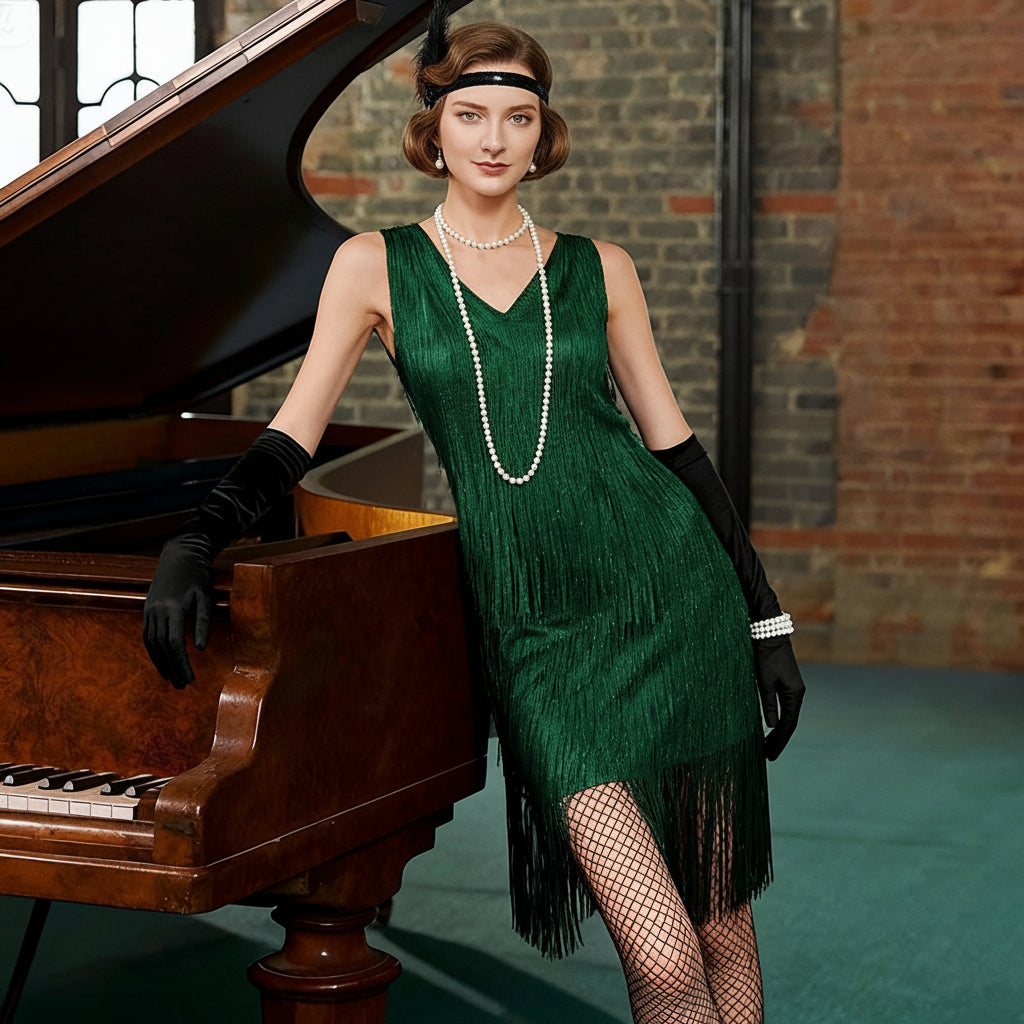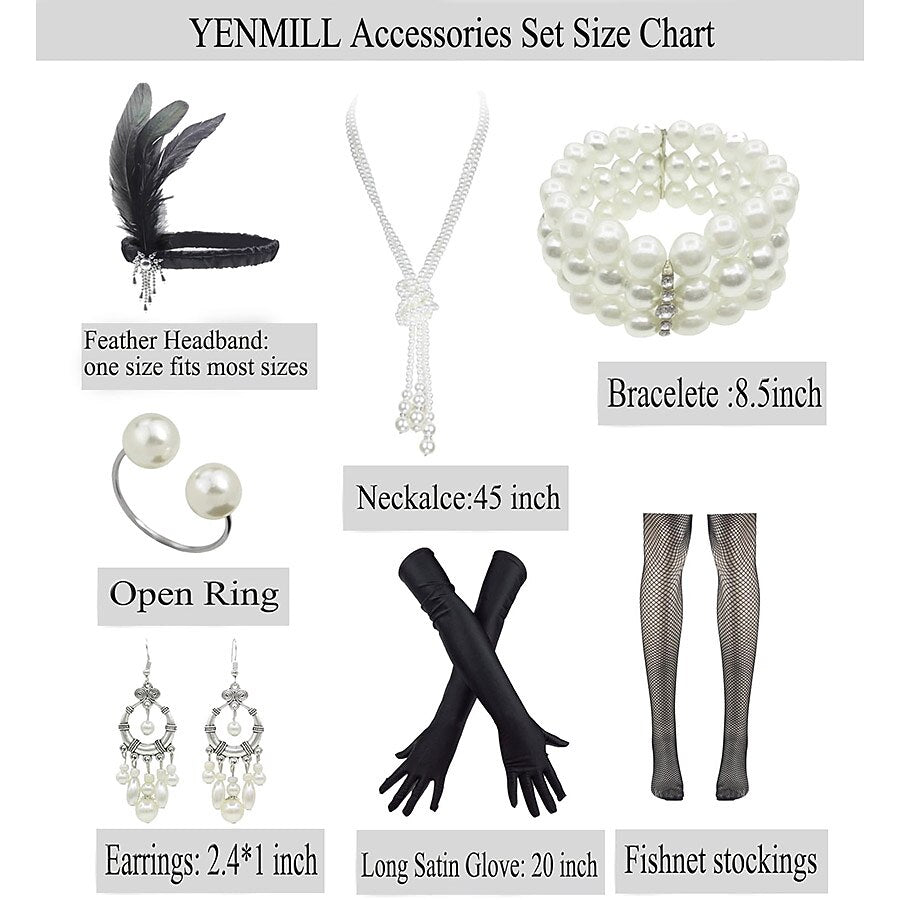 Channel the glamour of the Roaring 20s with this Women's Retro Vintage Flapper Dress and Accessories Set, perfect for a Great Gatsby themed event, Masquerade, Carnival, or any Party/Cocktail or Evening occasion. This adult V-neck, sleeveless, mini-length outfit, crafted from washable micro-elastic polyester, features dazzling sequin and tassel fringe designs, suitable for all seasons. What's in the box: Dress, Headwear, Gloves, Stockings, Neckwear, Bracelets & Bangles, Earrings.