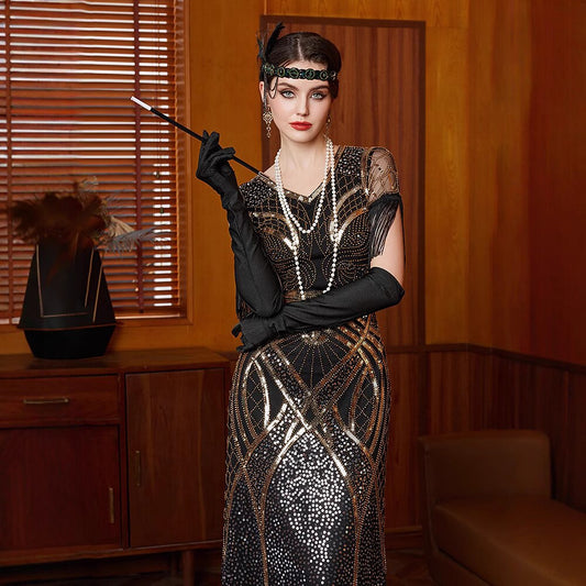 Sequin Tassel Trim Flapper Dress with ACCs